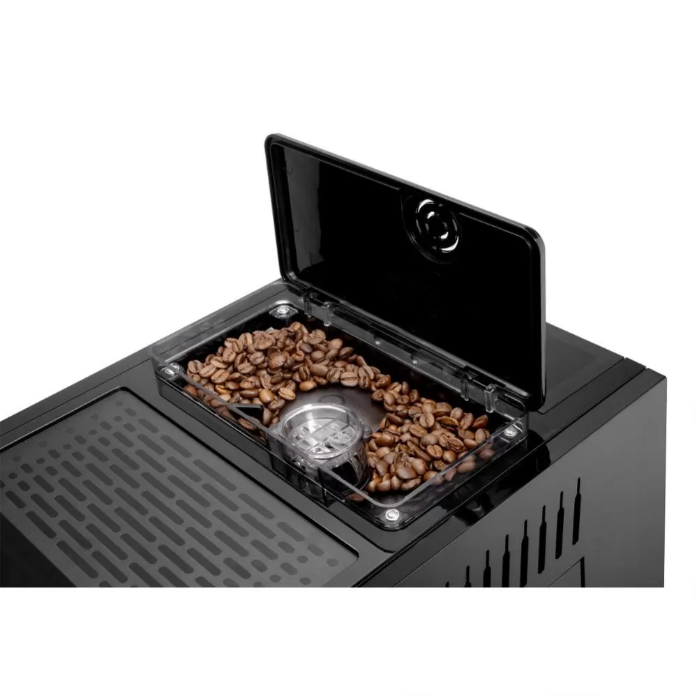 Automatické espresso má tlak 19 bar, je vybaveno ocelovým mlýnkem s možností nastavení hrubosti mletí, zásobníkem na kávu s kapacitou 250 g a signalizací docházející kávy.